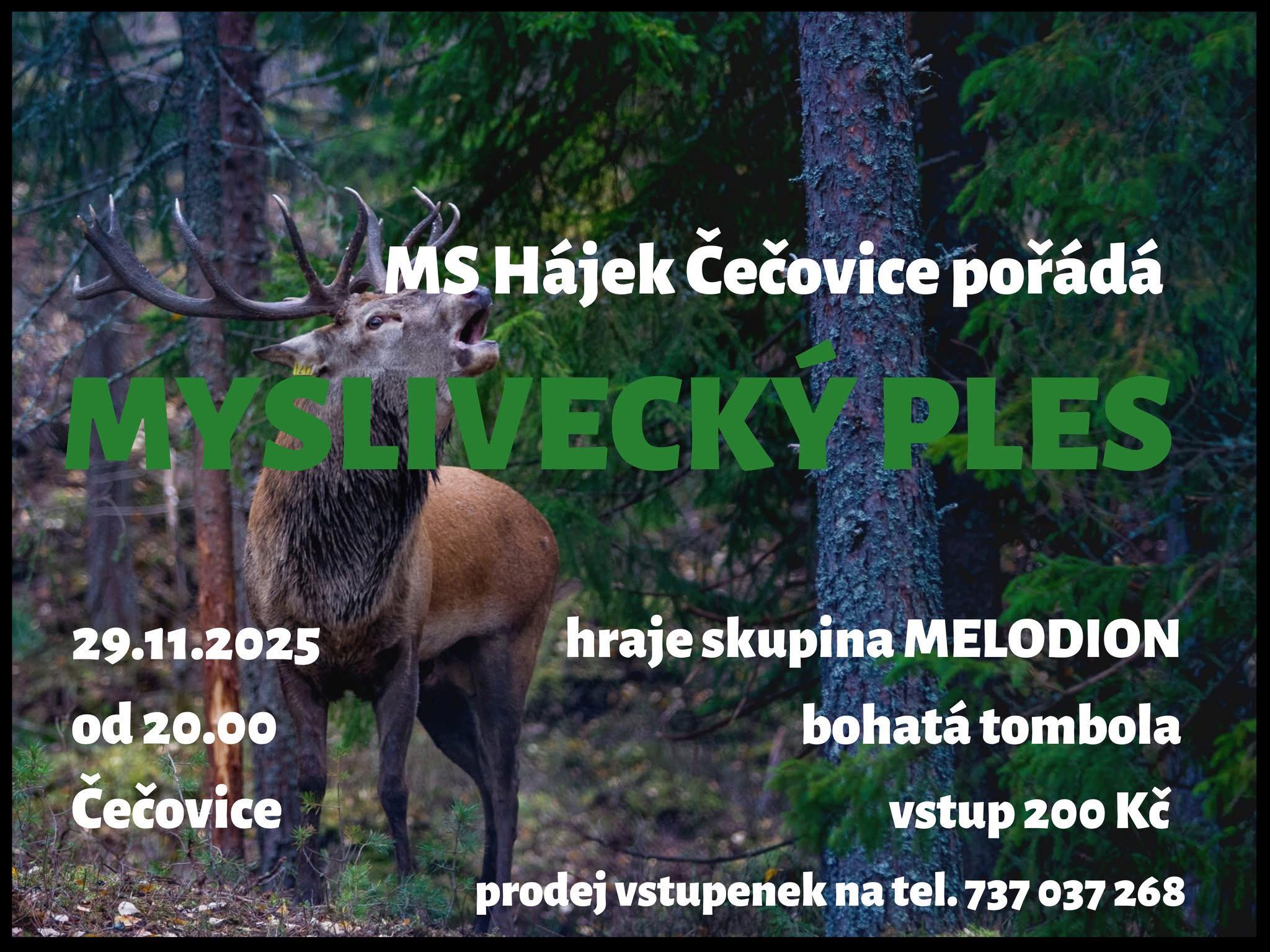 MS Hájek Čečovice srdečně zve na MYSLIVECKÝ PLES, který se uskuteční 29. 11. 2025 od 20 hod. Hraje skupina MELODION. Těšit se můžete i na tradiční bohatou tombolu.